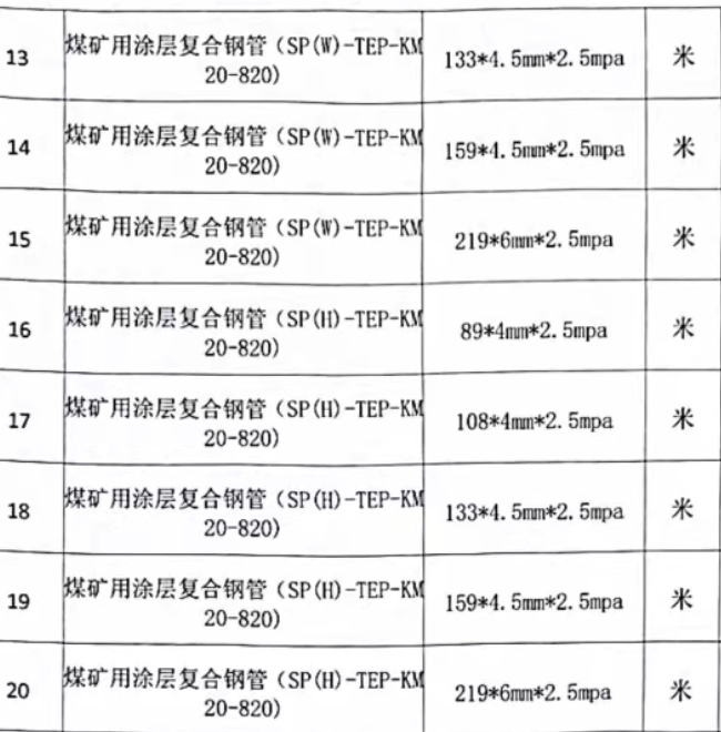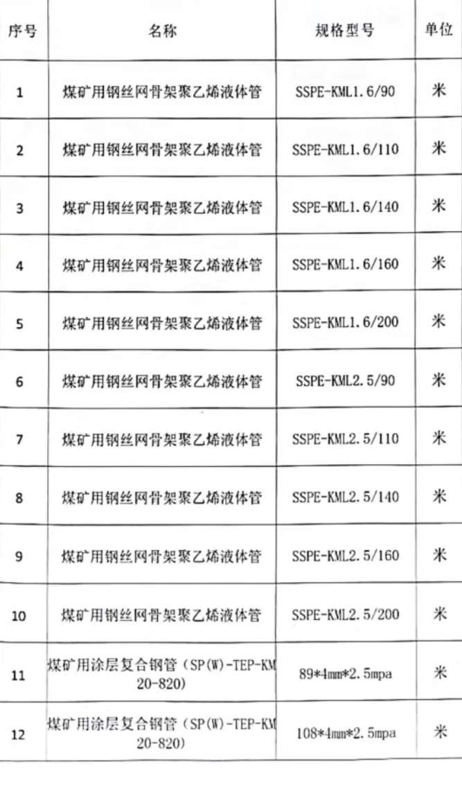采购需求:矿用管道(输水/输气/通风等全品类)