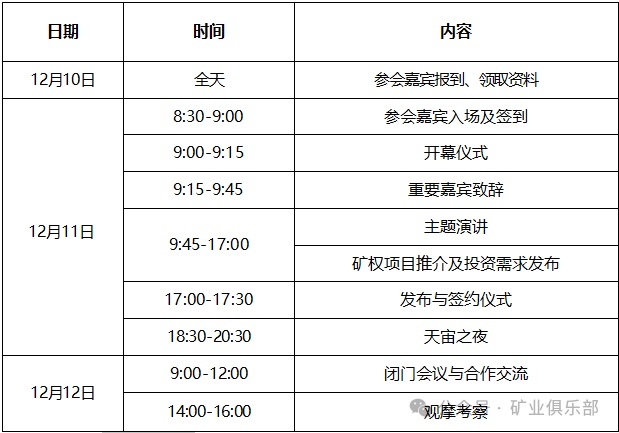 1. 宏观政策与市场展望(1)最新《中华人民共和国矿产资源法》深度解读与“新一轮找矿行动”等新政实施展望(2)全球矿业市场动态分析:国内外矿产资源格局及市场趋势等2. 风险防控与合规经营矿业权交易全流程风险识别与高效防控策略3. 绿色环保与智能转型(1)可持续发展的绿色矿业:实现环境效益与经济效益双赢之路(2)智慧矿山建设:从自动化到智能化,重塑矿业生产力4. 金融投资与产业建设如何打造产业资本化高质量发展平台,形成矿业产业链投资生态5. 国际合作与项目落地(1)如何构建产业共赢的国际矿业全产业链服务平台(2)优质矿业权项目专场推介会
