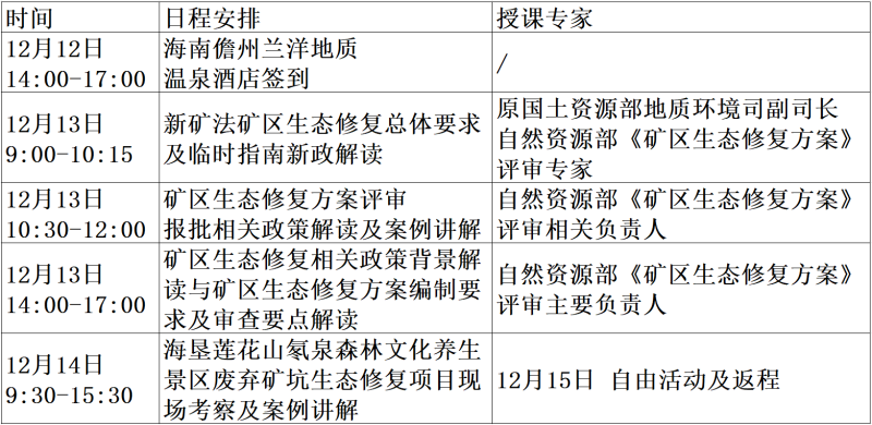 为助力相关人员掌握矿区生态修复方案编制要点、技术规范等,提升方案编制与审查业务能力,由中国国土经济学会主办,邀请自然资源主管部门相关负责人,矿区生态修复方案编制指南(临时)的起草者及该领域权威专家,于 2025 年12月13-14 日,在海南儋州,举办“矿区生态修复方案编制实战培训营”培训班。