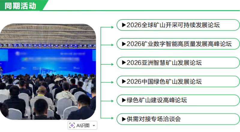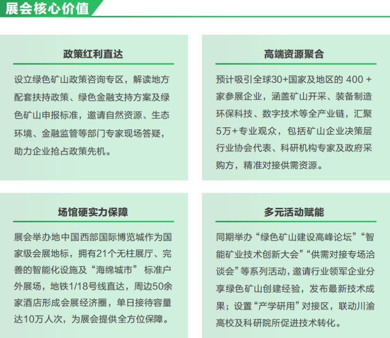作为全国矿产资源大省,四川已探明矿产资源储量居全国前列,钒、钛、锂等战略性矿产 储量更是冠绝全球,依托 “成渝地区双城经济圈” 国家战略加持,近年来持续推进绿色矿山建 设,截至2025年底,全省绿色矿山数量突破500家,形成从矿产勘探、绿色开采到资源循环利 用的完整产业链,成为西部绿色矿业发展的 “核心引擎”。 在双碳战略深入推进与绿色矿山建设加速落地的时代背景下,助力矿业行业实现 “矿区环 境生态化、开采方式科学化、资源利用高效化” 转型目标,我们诚挚邀请您参与 “2026 西部(成 都)国际绿色矿业博览会”6月11-13日在中国西部国际博览城举办(以下简称 “矿博会”)。 本次展会以 “绿色转型・科技赋能・产业共生” 为主题,由行业权威机构联合打造,旨在构 建辐射西部、链接全球的绿色矿业交流合作平台。依托成渝地区双城经济圈产业优势,聚焦绿色 开采技术、生态修复装备、智能矿山解决方案、资源循环利用等核心领域,为参展企业提供政策 对接、技术展示、商贸洽谈、资本联姻的全链条服务。 本次矿博会预计展出面积3万平米,参展企业400多家,专业观众预计5万多人次。邀请参 展参会知名企业有西部矿业、必和必拓、有色矿业、宝钢集团、智利铜业、中国黄金、紫金矿业 中国五矿、鞍钢矿业、招金矿业、玉溪大红山矿业、江铜集团、江钨集团、希尔威矿业、卡特彼 勒、艾法史密斯、利勃海尔、塔克拉夫、挪曼尔特、安百拓、西门子、美卓矿机、徐工集团、华 菱钢铁、铜陵有色、福建冶金、中国铝业、Weir矿业、GE、三菱电机、沈阳隆基、黎明重工等 国内外矿山生产企业和设备制造商,届时还邀请政府领导、专家学者、企业高管、协会领导等一 道解析行业发展形势,挖掘新动能,探寻发展思路,共同打造“创新、合作、发展、共赢”的全 球矿业合作平台。