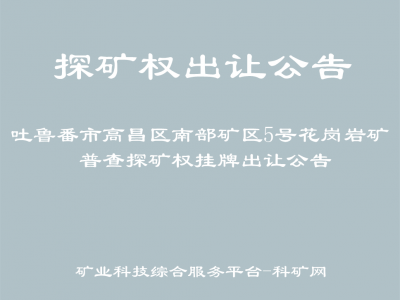 为深化矿产资源有偿使用制度,培育和建立规范、开放、竞争、有序的矿业权市场,促进矿产资源有序开发,根据《中华人民共和国矿产资源法》、《矿业权出让交易规则》(自然资规〔2023〕1号)、《关于印发〈新疆维吾尔自治区矿产资源管理若干事项暂行办法〉的通知》(新自然资规〔2021〕1号),经吐鲁番市人民政府批准,吐鲁番市自然资源局委托吐鲁番市建正建设工程交易有限公司以挂牌方式出让探矿权吐鲁番市高昌区南部矿区5号花岗岩矿普查。