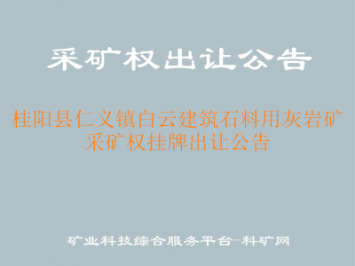 根据《中华人民共和国矿产资源法》《矿业权交易规则》(自然资规〔2023〕1号)《湖南省矿业权招标拍卖挂牌出让管理办法》等有关规定,郴州市自然资源和规划局委托郴州市公共资源交易中心以挂牌方式出让桂阳县仁义镇白云建筑石料用灰岩矿采矿权,现将有关事项公告如下:
