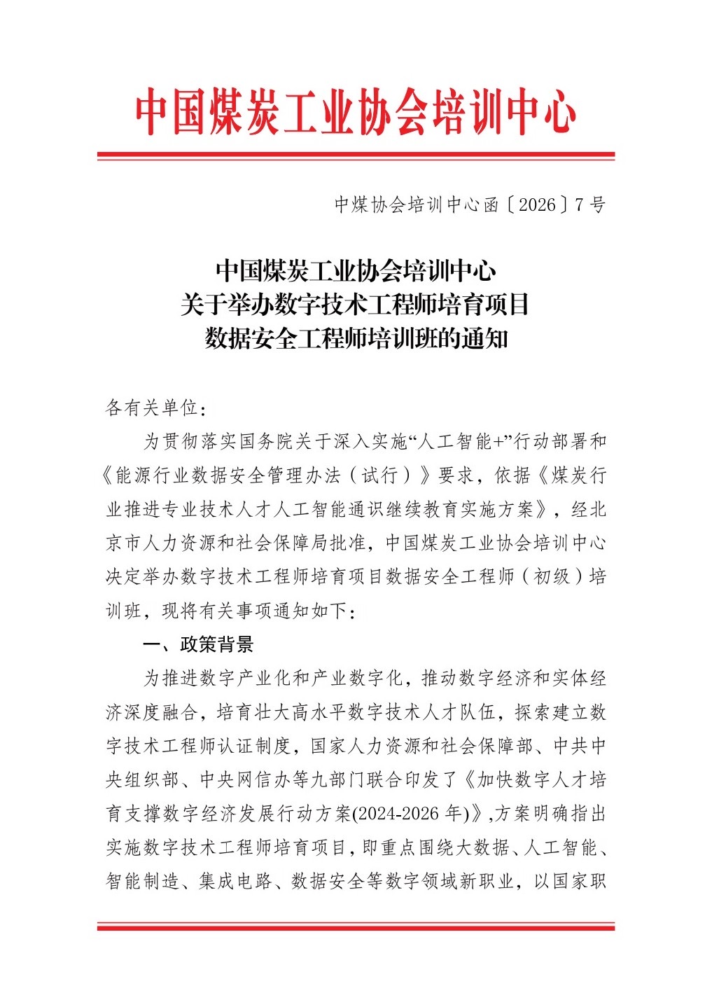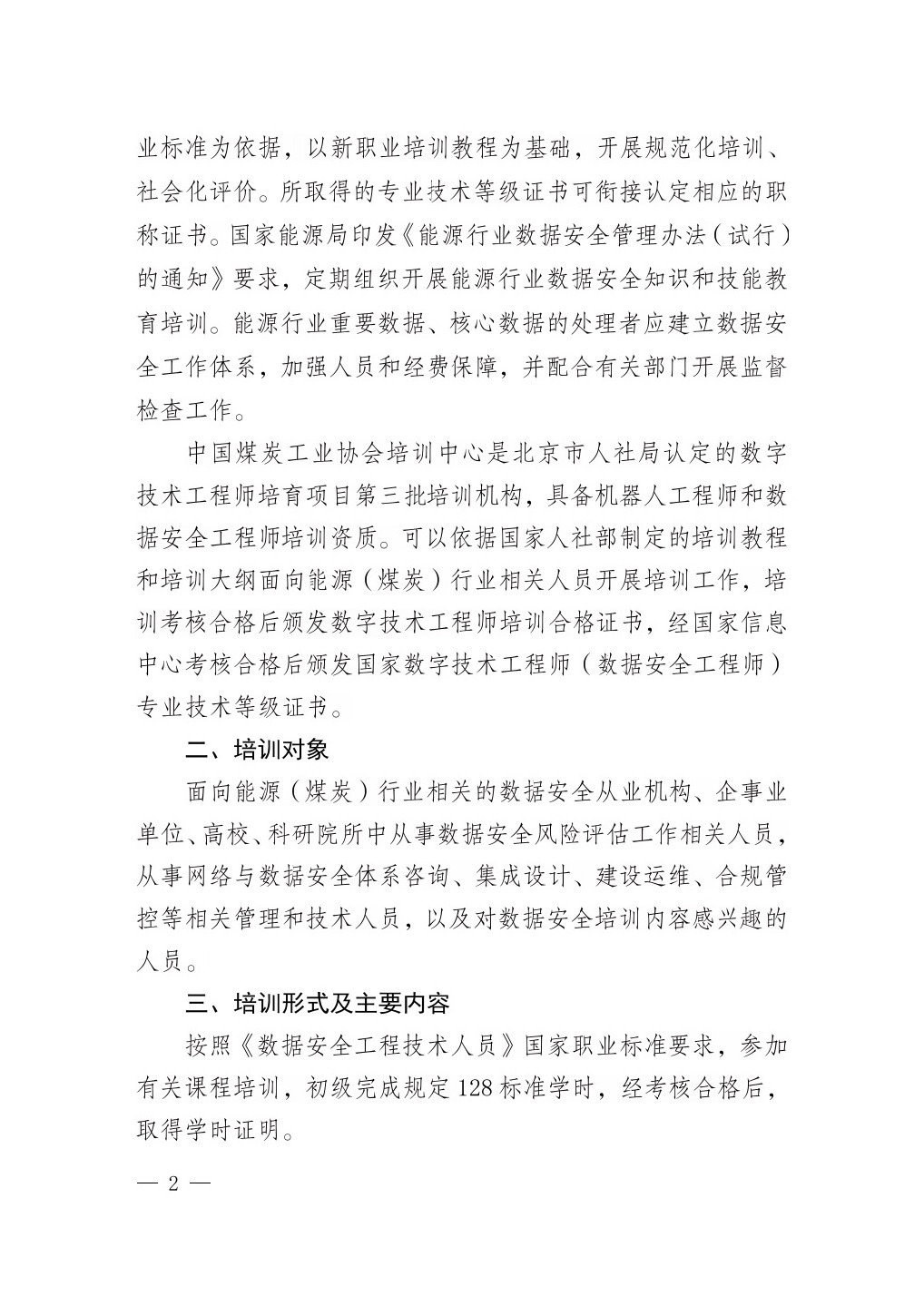 中国煤炭工业协会培训中心关于举办数字技术工程师培育项目数据安全工程师培训班的通知