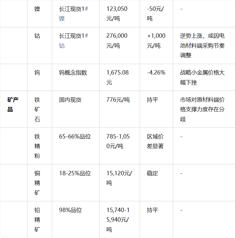 :高附加值金属(锡、镍)价格显著下探,受全球供应链扰动缓解及新能源产业链需求增速放缓影响。钴价逆势上涨,或因电池材料端采购节奏调整。 矿产品