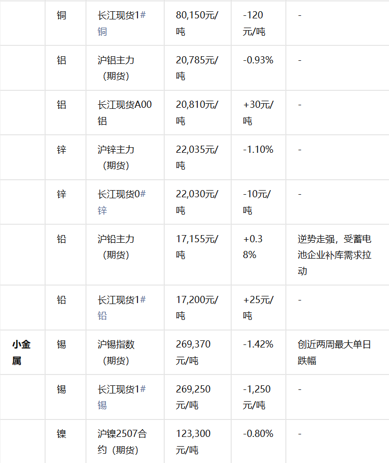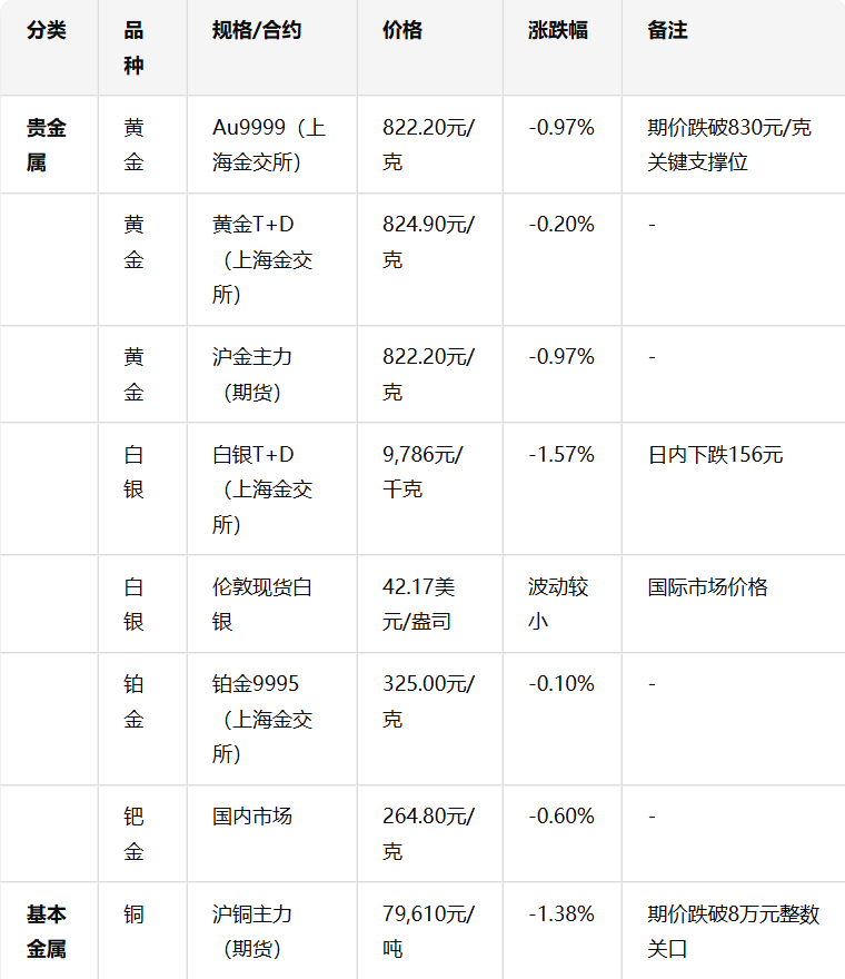 :价格全线承压,主因美联储鹰派降息预期及美元走强。黄金短期回调或延续,但长期看涨逻辑(全球货币宽松、地缘风险)未变。 基本金属