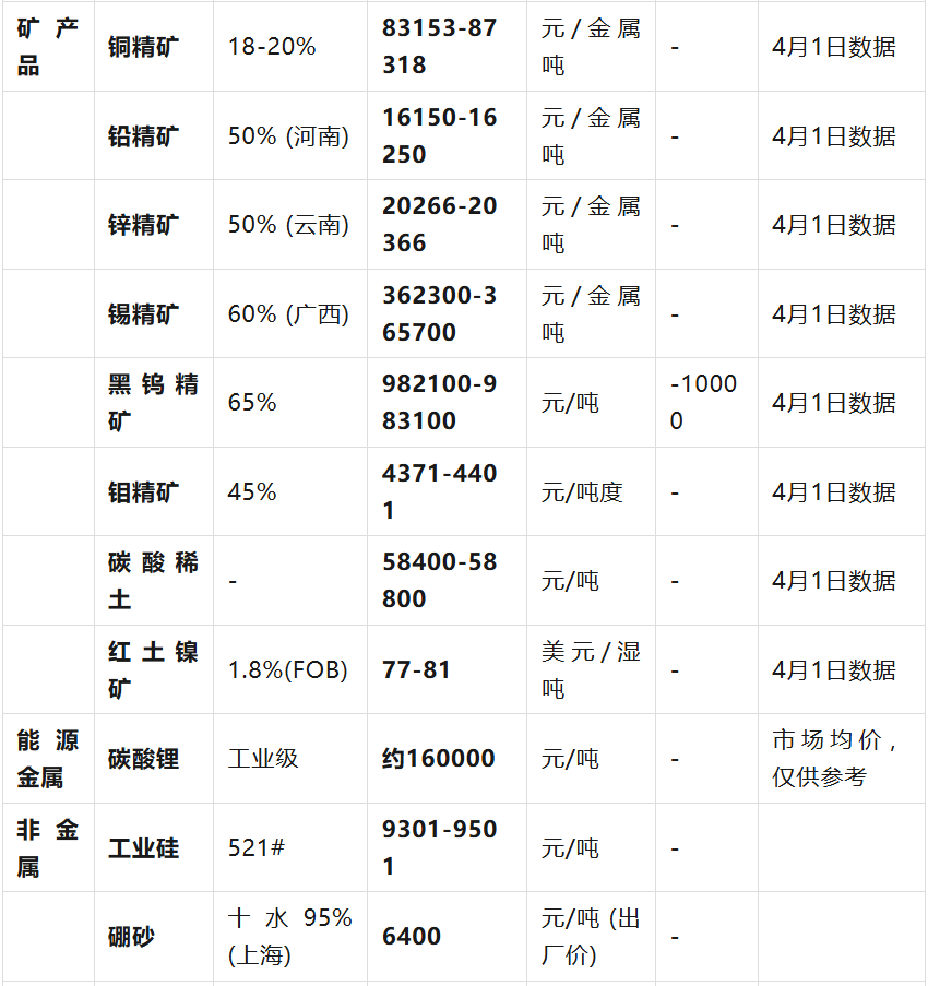 :以上表格中,大部分价格为2026年4月2日的最新报价。部分矿产品和稀有金属因数据更新频率问题,引用了4月1日的报价,已在“数据来源/备注”栏中注明,请留意。 价格波动