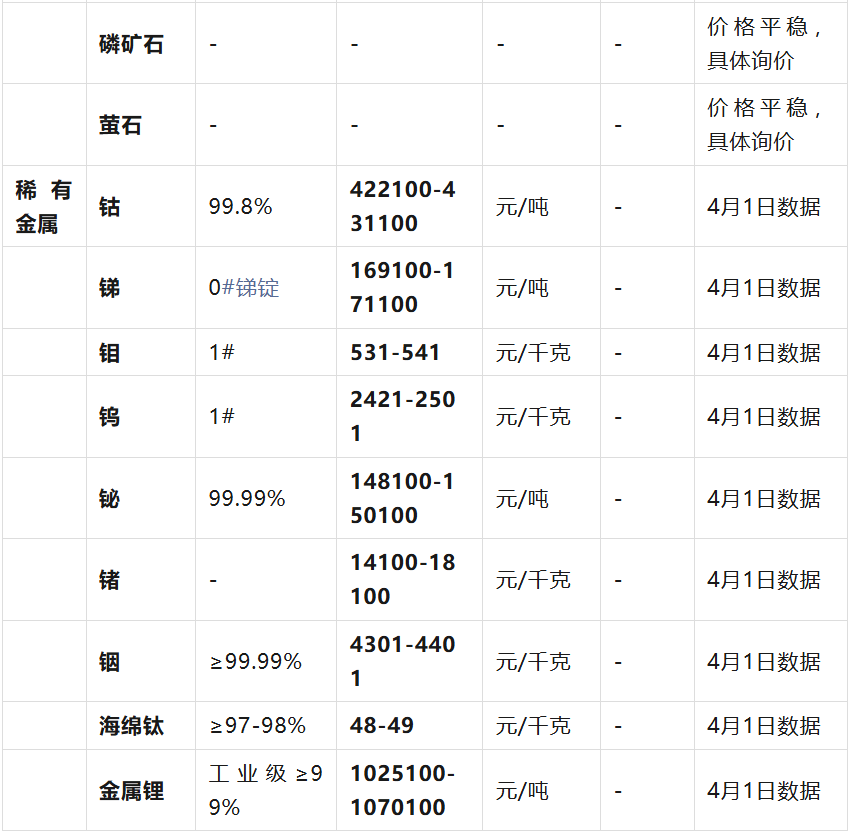 :如磷矿石、萤石等,搜索结果显示其价格运行平稳,但未提供具体报价,建议咨询相关供应商获取实时价格。 稀有金属