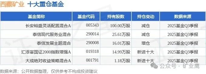 持有西藏矿业最多的基金为长安裕盛灵活配置混合A,目前规模为0.29亿元,最新净值0.7448(10月29日),较上一交易日上涨2.39%,近一年下跌13.92%。该基金现任基金经理为张云凯。