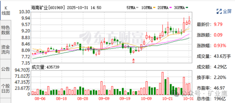 海南矿业(601969)10月30日发布2025年三季报,公司第三季度营业收入9.45亿元,同比下降4.13%;净利润3182.87万元,同比下降77.84%。2025年前三季度营业收入33.6亿元,同比增长5.93%;净利润3.12亿元,同比下降42.84%。报告期内铁矿石及原油市场价格下行导致公司利润总额同比下降。