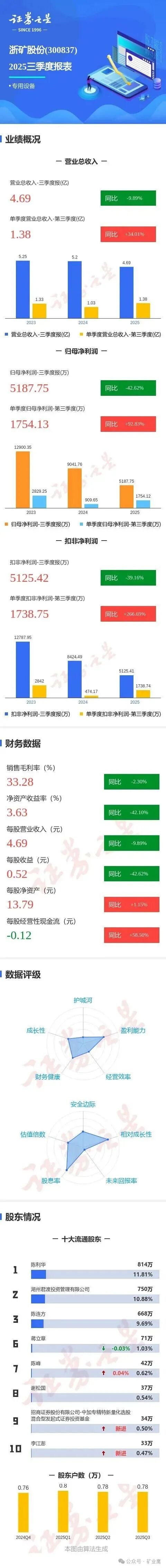 浙矿股份2025年三季报显示,前三季度公司主营收入4.69亿元,同比下降9.9%;归母净利润5187.75万元,同比下降42.62%;扣非净利润5125.42万元,同比下降39.16%;其中2025年第三季度,公司单季度主营收入1.38亿元,同比上升34.02%;单季度归母净利润1754.13万元,同比上升92.83%;单季度扣非净利润1738.75万元,同比上升266.69%;负债率35.53%,投资收益22.58万元,财务费用-73.79万元,毛利率33.28%。