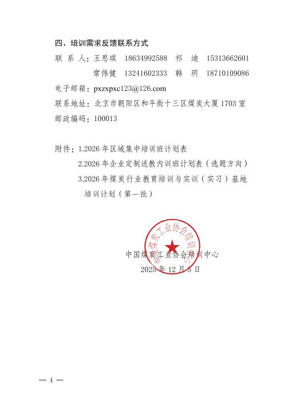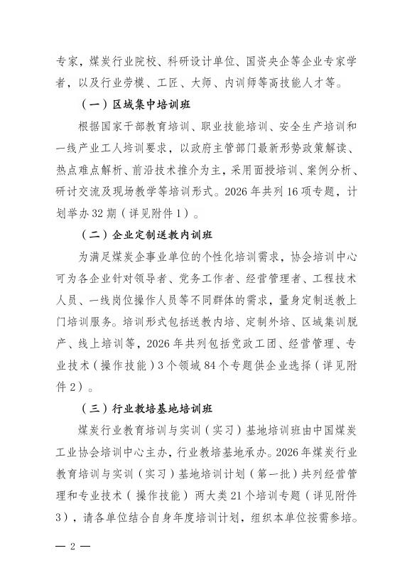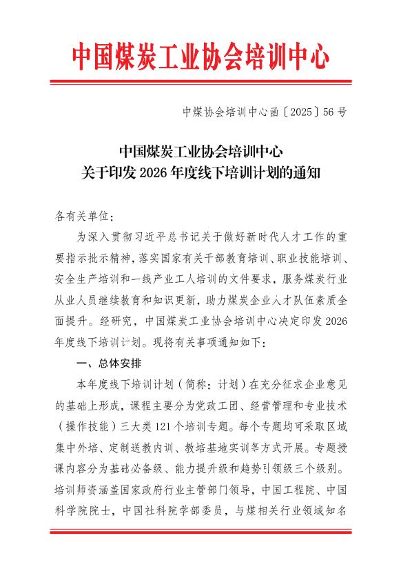 中国煤炭工业协会培训中心关于印发2026年度线下培训计划的通知