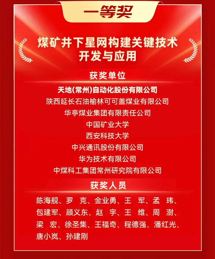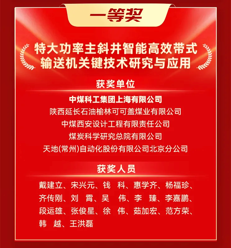 12月10日,2025年度中国煤炭工业协会科学技术奖评选结果在北京揭晓,中国煤科常州研究院(常州股份)牵头完成的“煤矿井下星网构建关键技术开发与应用”荣获一等奖,中国煤科常州研究院(常州股份)参与完成的“特大功率主斜井智能高效带式输送机关键技术研究与应用”荣获一等奖。