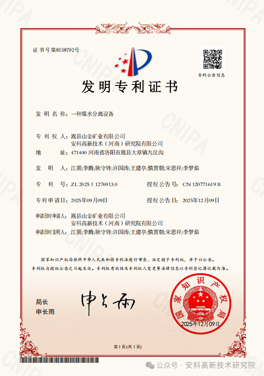 近日,安科高新技术 (河南) 研究院有限公司与嵩县山金矿业有限公司携手攻关的技术成果—“一种煤水分离设备”,获得国家发明专利。这是双方产学研深度融合的重要突破,更是安科高新院在绿色矿业装备领域创新实力的有力印证!