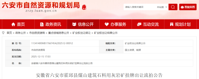 安徽省六安市霍邱县煤山建筑石料用灰岩矿挂牌出让流拍公告