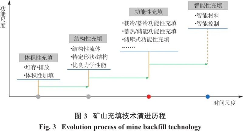 2 新型矿山充填技术分类及演进历程根据矿山充填材料性能,本研究将充填采矿技术的发展历程划分为4个阶段:体积性充填→结构性充填→功能性充填→智能性充填,如图3所示。