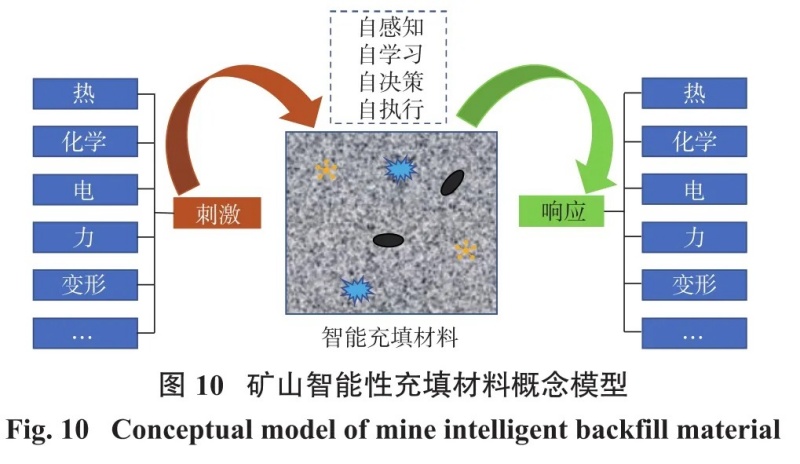 矿山智能充填材料概念模型如图10所示。智能材料在土木工程中已有研究,如光纤维混凝土、玻璃空心纤维混凝土、记忆合金混凝土等智能材料通过自适应和自诊断功能,可提高混凝土结构的稳定性。