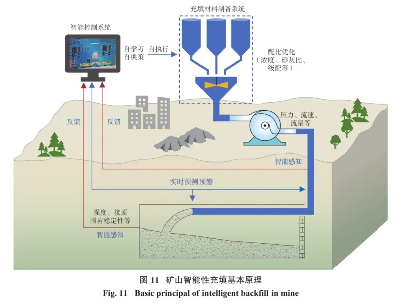 2.4.2 智能充填控制智能充填控制是具有智能信息处理、智能信息反馈和智能控制决策的控制方式。将物联网、云计算、大数据、人工智能、自动控制、移动互联网、机器人装备等与现代矿山充填技术深度融合,使充填过程中的搅拌、管道输送等主要充填系统具有自感知、自学习、自决策与自执行的基本能力。基于智能充填材料能对外部环境和自身所处环境进行感知,对充填料浆在管道输送中的压力、流速以及流入采空区后对采空区环境(如围岩稳定性、充填料浆在采空区中的流动特性、接顶情况和充填体的强度等)进行感知,并将所获信息反馈给控制系统。通过智能控制系统的自学习、自决策来不断优化配比(浓度、砂灰比、级配等),实时调整,同时能对矿山充填事故进行实时预测和预警、快速决策与自处理等,从而避免充填事故发生,提高充填体稳定性和充填效率,降低充填成本和工人劳动强度,实现充填材料搅拌、管道运输、安全保障等过程的智能化运行,形成矿山全面感知、实时互联、分析决策、自主学习、动态预测、精准协同控制的完整智能系统,最终实现矿山充填的智能化。矿山智能性充填基本原理如图11所示。