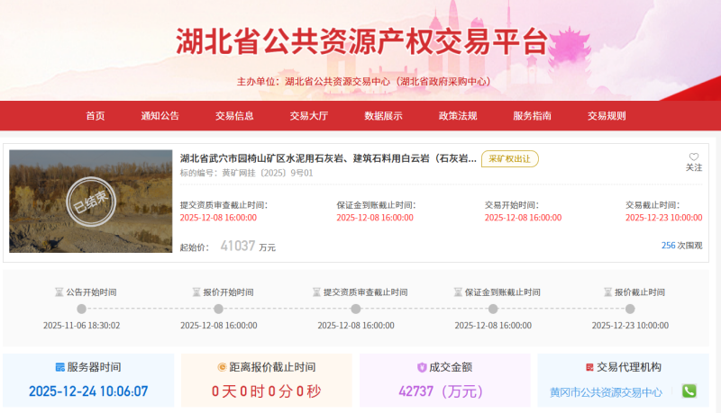12月23日,湖北武穴市园椅山矿区水泥用石灰岩、建筑石料用白云岩(石灰岩)矿成功出让。该项资源储量超2.82亿吨,生产规模950万吨/年,出让30年,挂牌起始价超4.1亿元。黄冈亚东水泥有限公司报价超4.27亿元竞得。