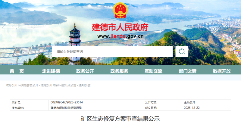 近日,浙江建德市规划和自然资源局对《浙江省建德市梅城镇滨江村官路边矿区建筑用安山岩矿生态修复方案》进行了评审,现将拟同意通过的方案和专家意见进行公示,公示期为自发布之日起7个工作日。