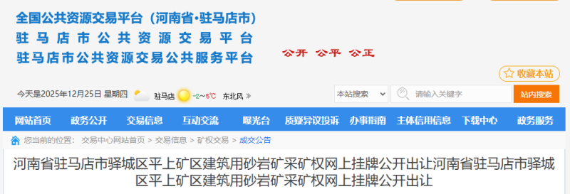 据悉,该采矿权坐落于驻马店市驿城区沙河店镇,占地1.3894平方千米。此次出让为老矿山退出后的重新规划,意味着新的采矿权竞得人不仅需缴纳采矿权出让收益,还需在成交结果公示后20日内,向驿城区财政局指定账户缴纳1.004亿元,用以补偿原采矿权人。