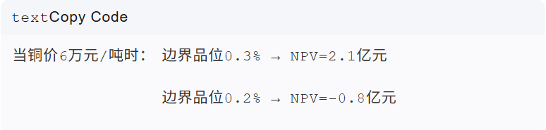 设置价格波动区间(±20%)、成本变动(±15%)示例:铁矿当价格从800元/吨降至640元/吨时,边界品位需从25%提高至28%