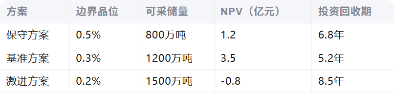 当地质建议指标与经济指标矛盾时,采用"地质可行域+经济约束带"双重控制示例:某金矿地质推荐边界品位1.5g/t,但经济分析要求2.0g/t,最终取1.8g/t并配套优化选矿流程
