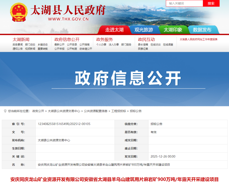 近日,安徽省太湖县人民政府网站发布安庆同庆龙山矿业资源开发有限公司太湖县羊乌山建筑用片麻岩矿900万吨/年露天开采建设项目招标公告。