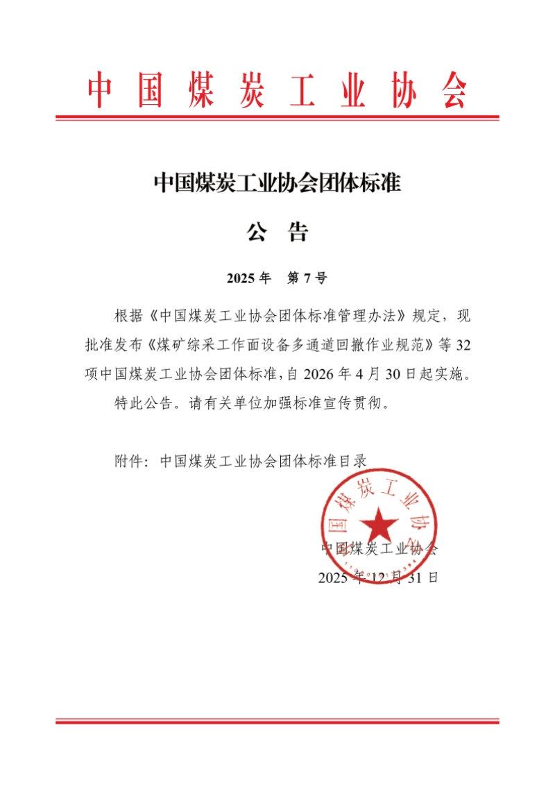 中国煤炭工业协会团体标准公告