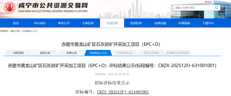 近日,湖北省咸宁市公共资源交易网发布赤壁市黄龙山矿区石灰岩矿开采加工项目(EPC+O)评标结果公示。