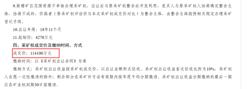 新增矿区范围资源不单独办理采矿权,出让后与原采矿权整合后开发利用,竞买人与原采矿权人协商确定整合主体,协商不成的,价高者(原采矿权评估价与本次采矿权成交价对比)为整合主体,由整合主体按照相关规定办理采矿登记手续。缴费方式灵活,采矿权出让收益首缴10%,可自愿一次性缴清全款,剩余部分按规分期缴纳。目前成交结果正处于公示期,公示时间从2025年12月31日至2026年1月14日。