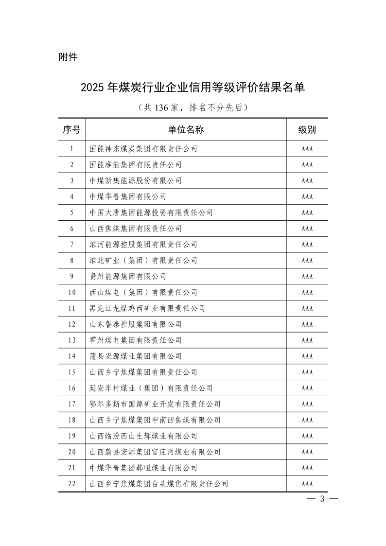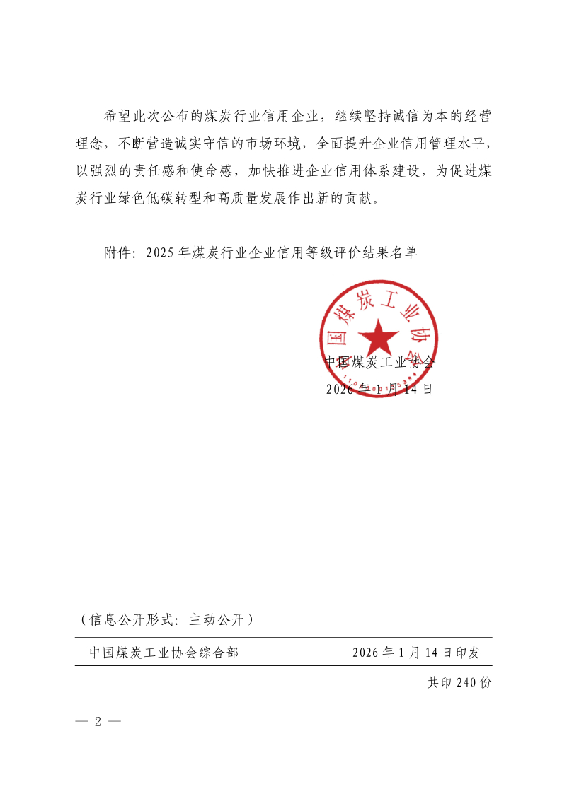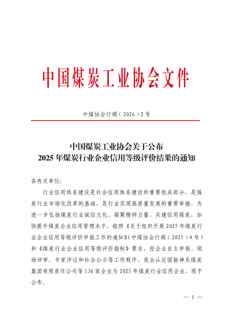 关于公布2025年煤炭行业企业信用等级评价结果的通知