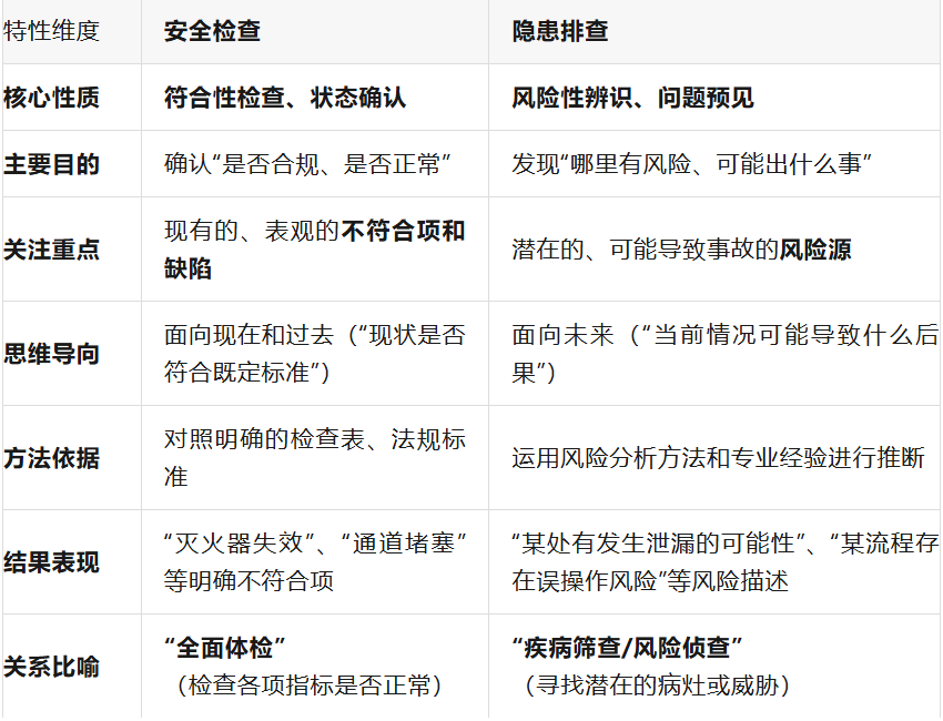 基础与深化:安全检查是隐患排查的基础。很多隐患排查工作是在安全检查过程中,通过更深入的观察和分析发现的。一个表面的“不符合项”(如地面有油污),其背后可能隐藏着设备泄漏、维护不当等深层次隐患。