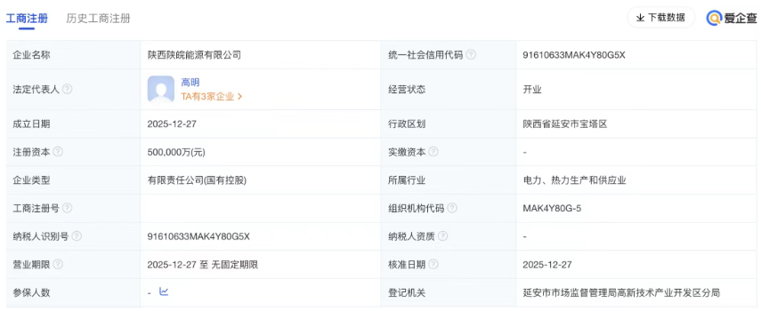 近日,陕西陕皖能源有限公司在陕西省延安市成立,出资高达50亿元,法定代表人为高明。该企业由大唐集团、延长石油、皖能集团等央国企合资成立。