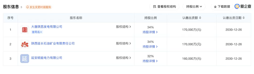 新公司由中国大唐集团二级全资子公司大唐陕西发电有限公司、陕西延长石油(集团)有限责任公司二级全资子公司陕西延长石油矿业有限责任公司,以及安徽省能源集团控股子公司延安皖能电力有限公司三家共同出资,前二者分别出资17亿元,持股34%;后者出资16亿元,持股32%。