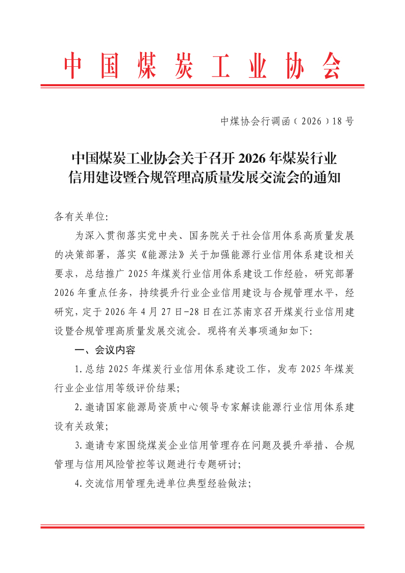 关于召开2026年煤炭行业信用建设暨合规管理高质量发展交流会的通知