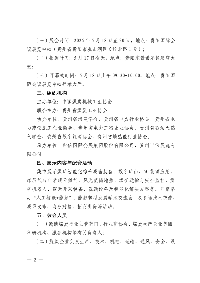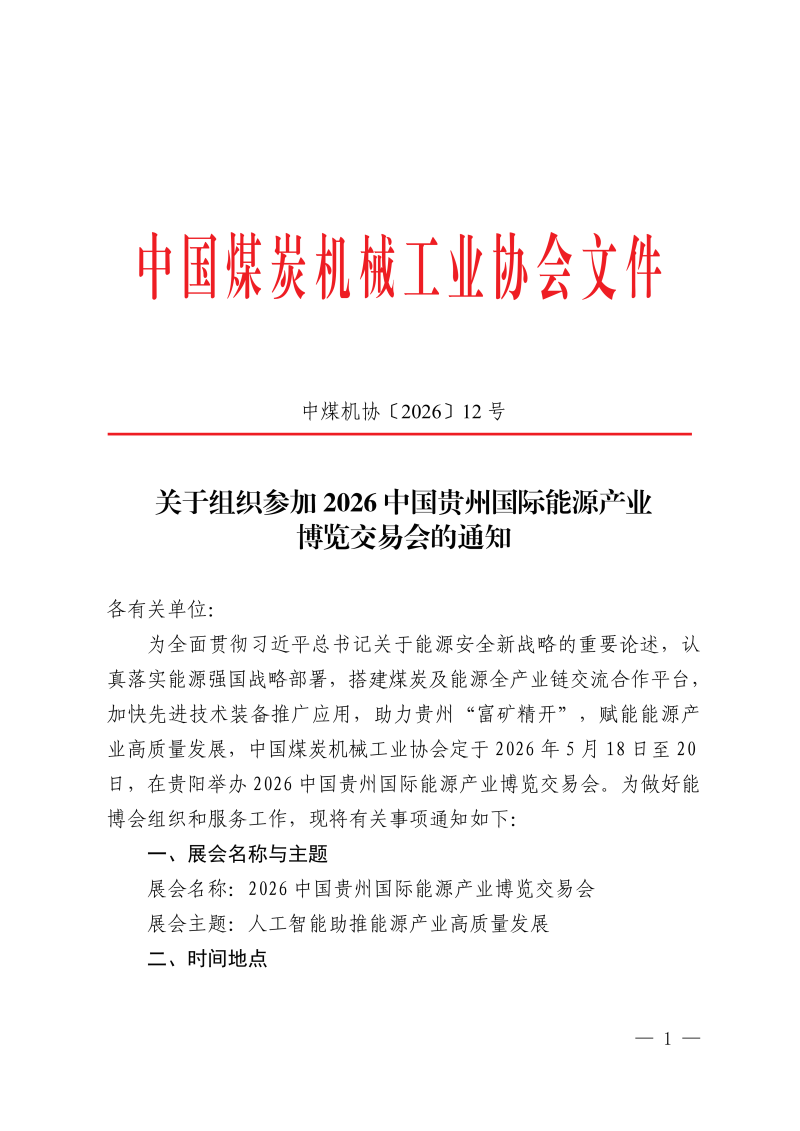 为全面贯彻习近平总书记关于能源安全新战略的重要论述,认真落实能源强国战略部署,搭建煤炭及能源全产业链交流合作平台,加快先进技术装备推广应用,助力贵州“富矿精开”,赋能能源产业高质量发展,中国煤炭机械工业协会定于2026年5月18日至20日,在贵阳举办2026中国贵州国际能源产业博览交易会。