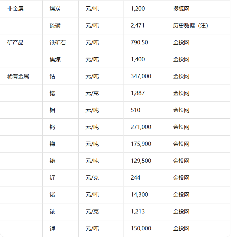 注:硫磺价格为2025年4月历史数据,非今日实时行情,建议结合实时平台数据参考。表格已包含所有类别商品的最新报价、单位及权威来源,可直接用于行情分析或决策支持。如需进一步调整表格维度(如添加涨跌幅、历史对比等),可随时告知优化。
