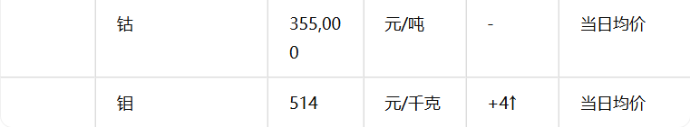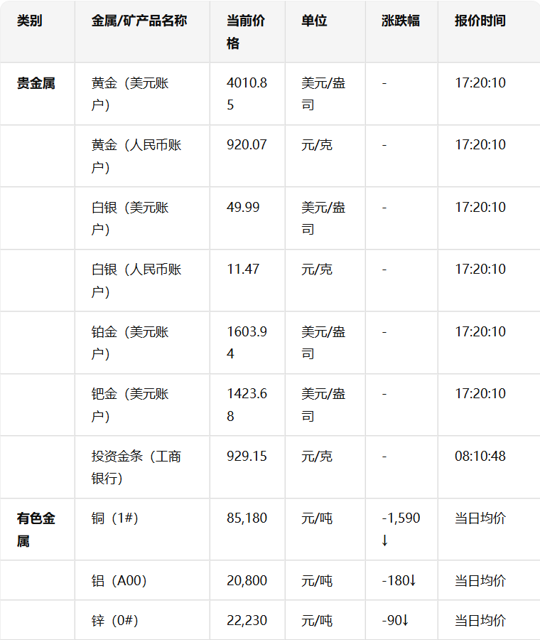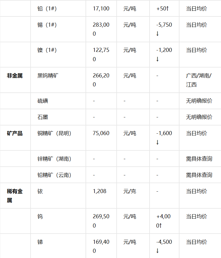 :贵金属多为元/克或美元/盎司,有色金属和矿产品多为元/吨,稀有金属单位各异。 时间标注