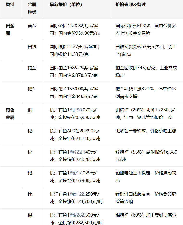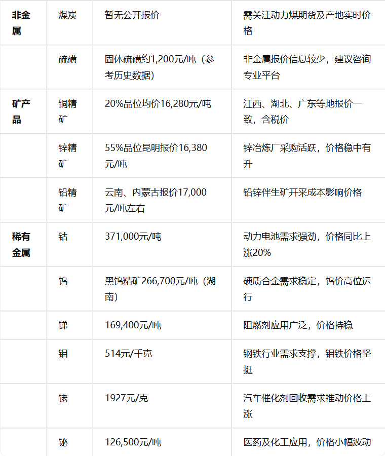 数据综合自长江有色金属网、金投网、矿道网等权威平台,报价时间为2025年10月14日; 贵金属价格包含国际/国内双轨报价,反映实时行情与回收价值; 有色金属及矿产品价格以吨为单位,稀有金属按克/千克计价,非金属因种类繁多仅列示典型品种; 部分非金属(如煤炭)缺乏公开报价,建议通过专业期货平台或产地信息查询; 稀有金属中,钴、钨、锑等因战略资源属性,价格受政策及下游需求影响显著。