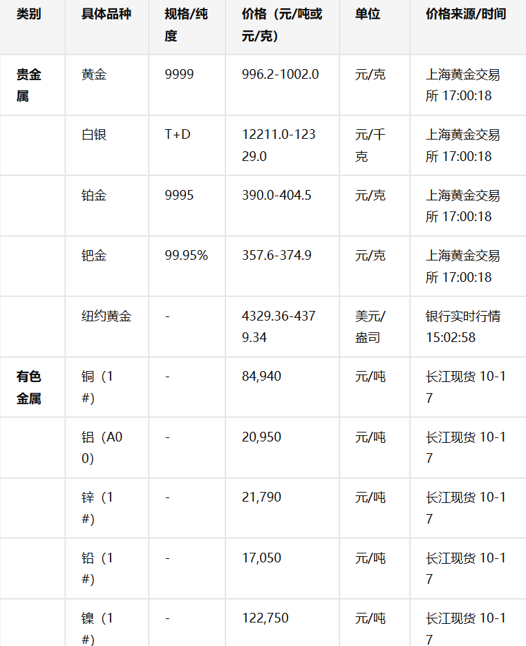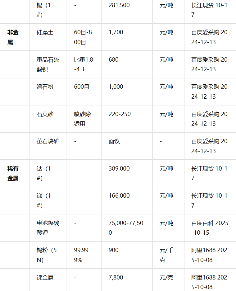 :报价均为2025年10月17日实时或当日最新数据,部分非金属数据更新至2024年12月(标注来源时间)。 单位规范