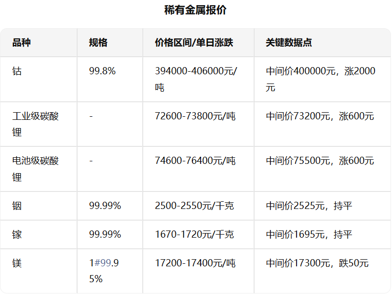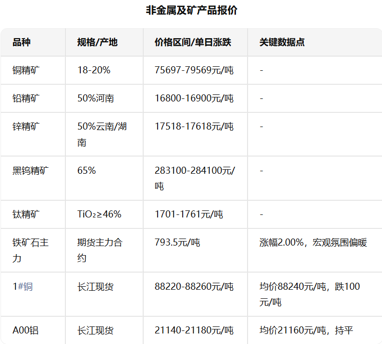 贵金属数据主要来自上海黄金交易所实时行情,有色金属为伦敦金属交易所(LME)10月28日收盘价,非金属及矿产品来自中国有色网长江现货行情,稀有金属来自上海金属网及市场报价。 价格单位统一为人民币元(国际品种为美元/吨或美元/千克),期货合约标注具体月份。 涨跌幅基于前一日收盘价计算,部分品种因市场波动较小或数据更新延迟标注“-”。