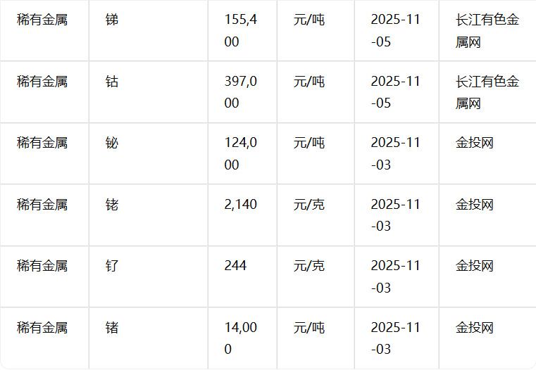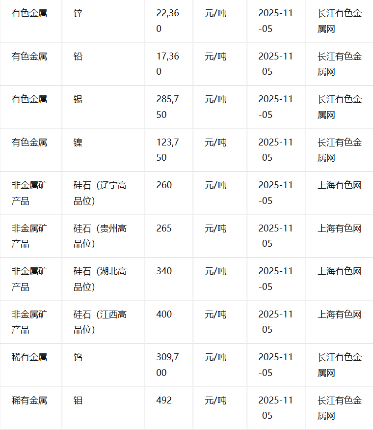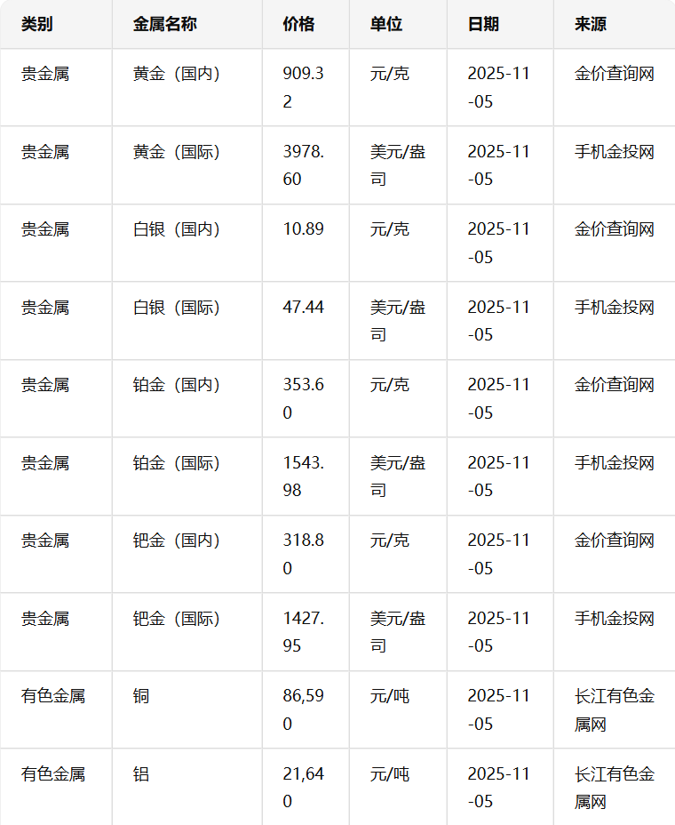 :包含国内及国际市场报价,国内价格来自金价查询网,国际价格来自手机金投网,均反映2025年11月5日实时行情。 有色金属
