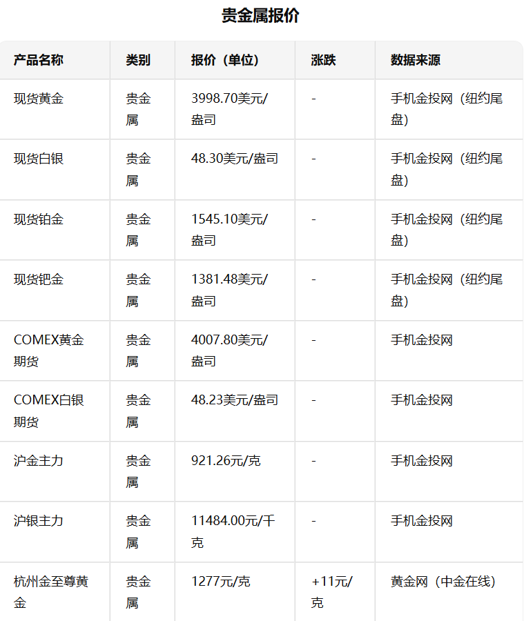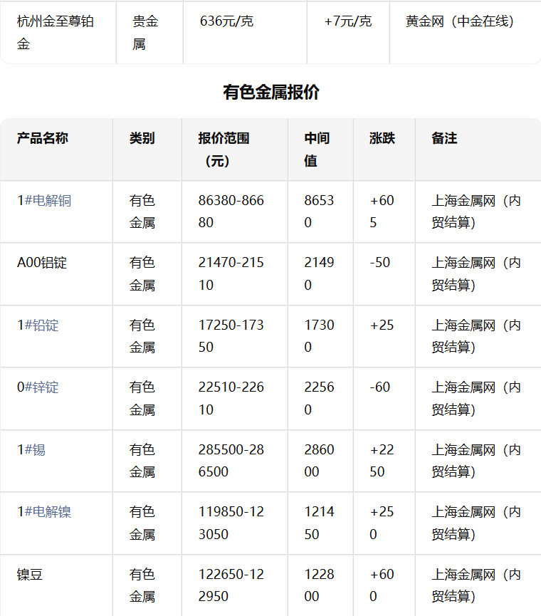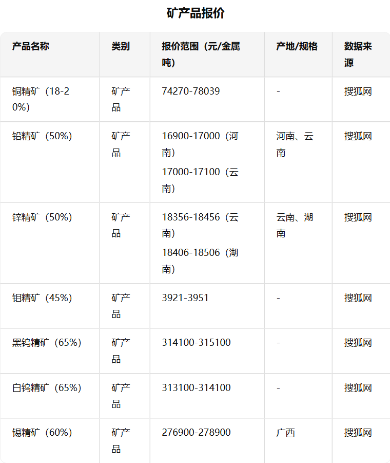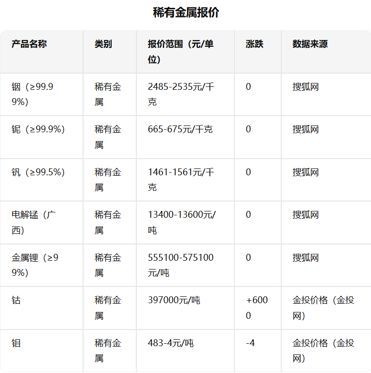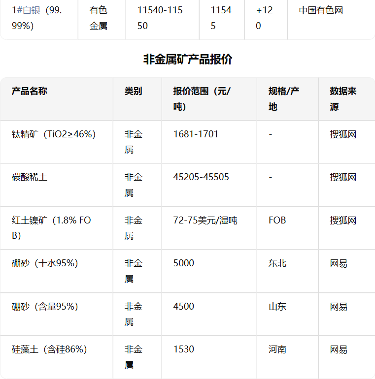 数据来源于手机金投网、中国有色网、搜狐网、网易、黄金网(中金在线)、金投价格(金投网)等权威平台,时间均为2025年11月10日。 报价包含单位、涨跌及数据来源,部分产品标注产地或规格以区分差异。 稀有金属中“钼”的报价“483-4元/吨”可能存在输入误差,建议以权威平台实时数据为准。 非金属及矿产品报价多涉及产地或规格,需结合具体需求参考。