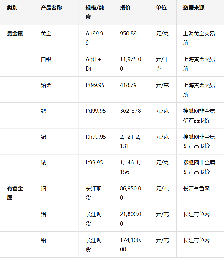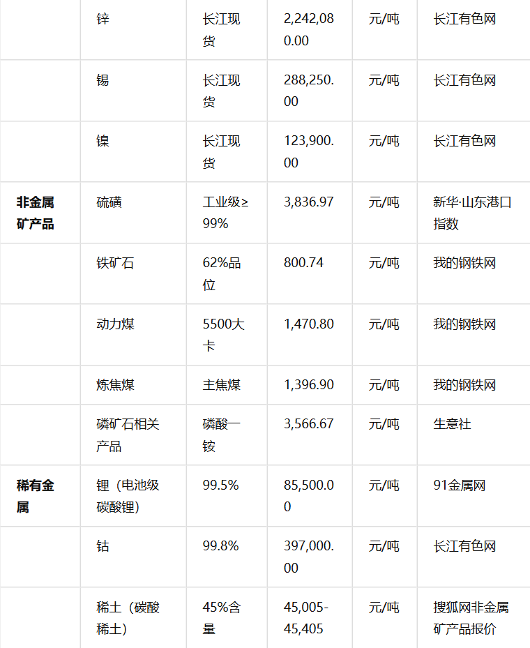 数据均来自2025年11月11日当日或最近更新的权威平台报价; 非金属矿产品中的磷矿石直接报价较少,表中采用其下游产品磷酸一铵的参考价; 稀有金属中的锂采用电池级碳酸锂价格,符合当前新能源产业链需求; 部分产品如钯、铑、铱等因市场波动较大,报价区间已标注; 单位统一采用国际通用计量单位(克/千克/吨),便于横向对比。