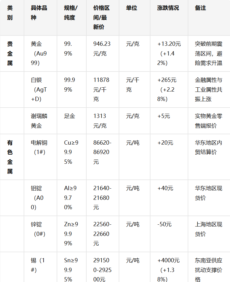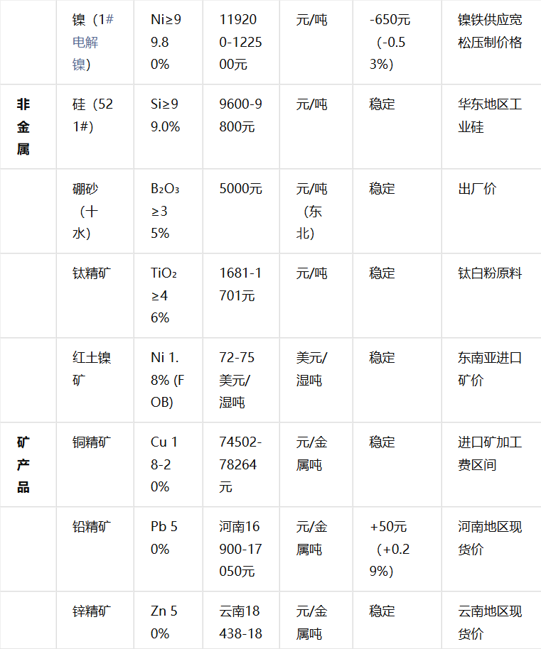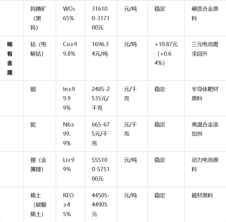 价格单位统一为人民币元,部分国际矿种保留美元计价。 涨跌情况基于当日与前一日对比,部分品种因市场波动幅度较小标注“稳定”。 数据来源包括上海金属网、中国有色网、网易财经等权威平台,综合反映2025年11月12日国内主要市场实时行情。 贵金属价格受地缘政治及美元指数影响显著,有色金属中锡、铜因供需格局差异表现分化,稀有金属中钴受新能源需求拉动上涨。