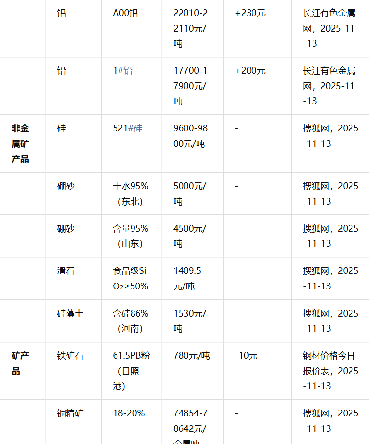 :标注了与前一日或近期(如10月初)相比的价格变动,部分非金属矿产品因缺乏近期对比数据,标注为“-”。