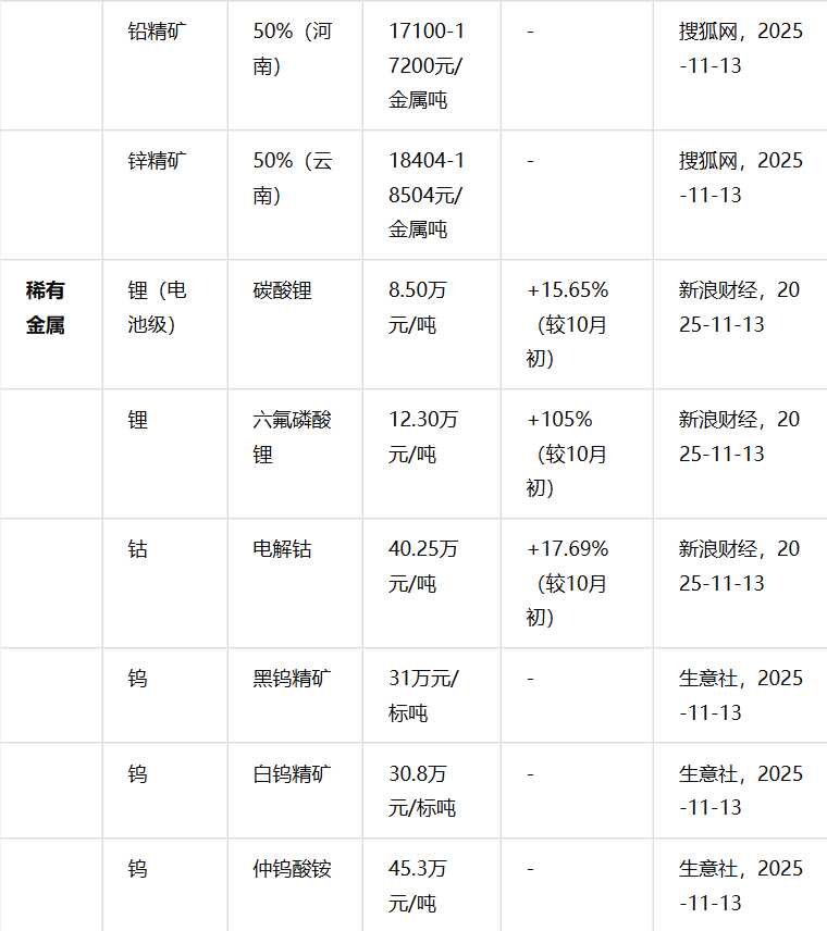 :稀有金属中钼的报价数据因来源不一致未纳入;钨、锑等价格受供需影响显著,建议关注市场动态。