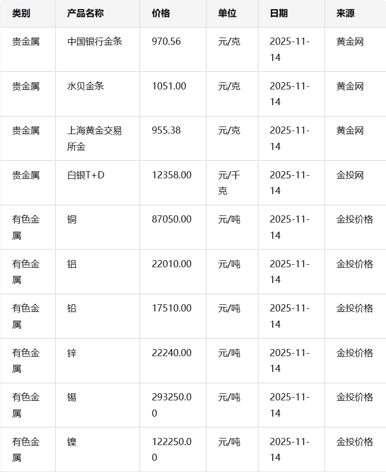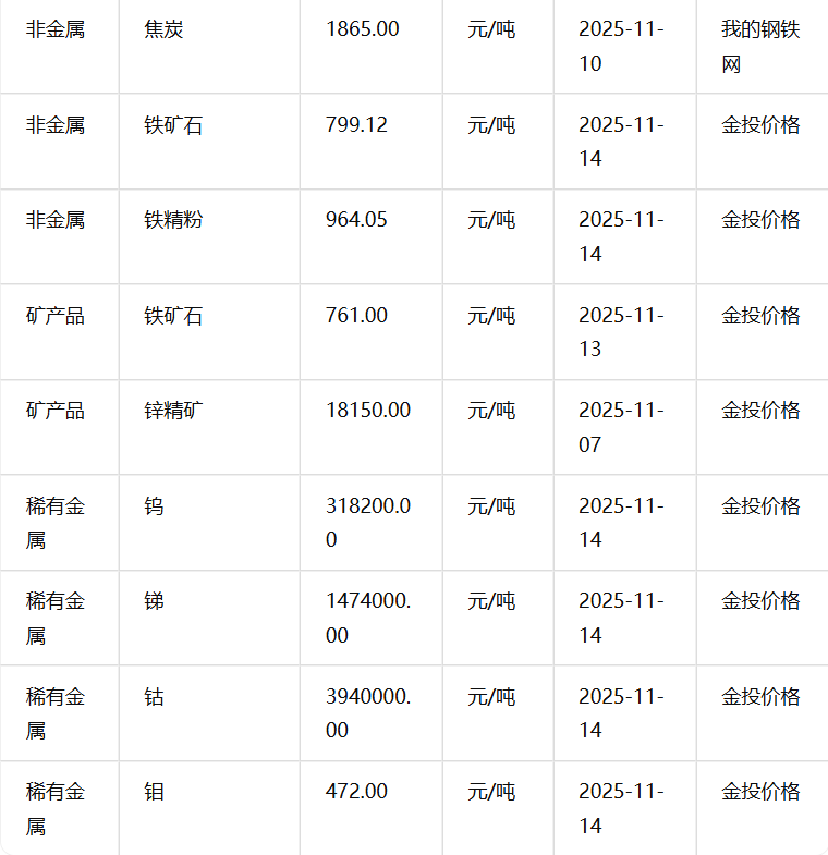 贵金属中,水贝金条价格最高(1051元/克),白银T+D价格达12358元/千克; 有色金属里,锡以293250元/吨居首,铜、铝、铅、锌、镍均呈现不同价位; 非金属中,焦炭价格为1865元/吨(11月10日数据),铁矿石和铁精粉为最新报价; 稀有金属中,锑以147.4万元/吨领跑,钴、钨、钼紧随其后。