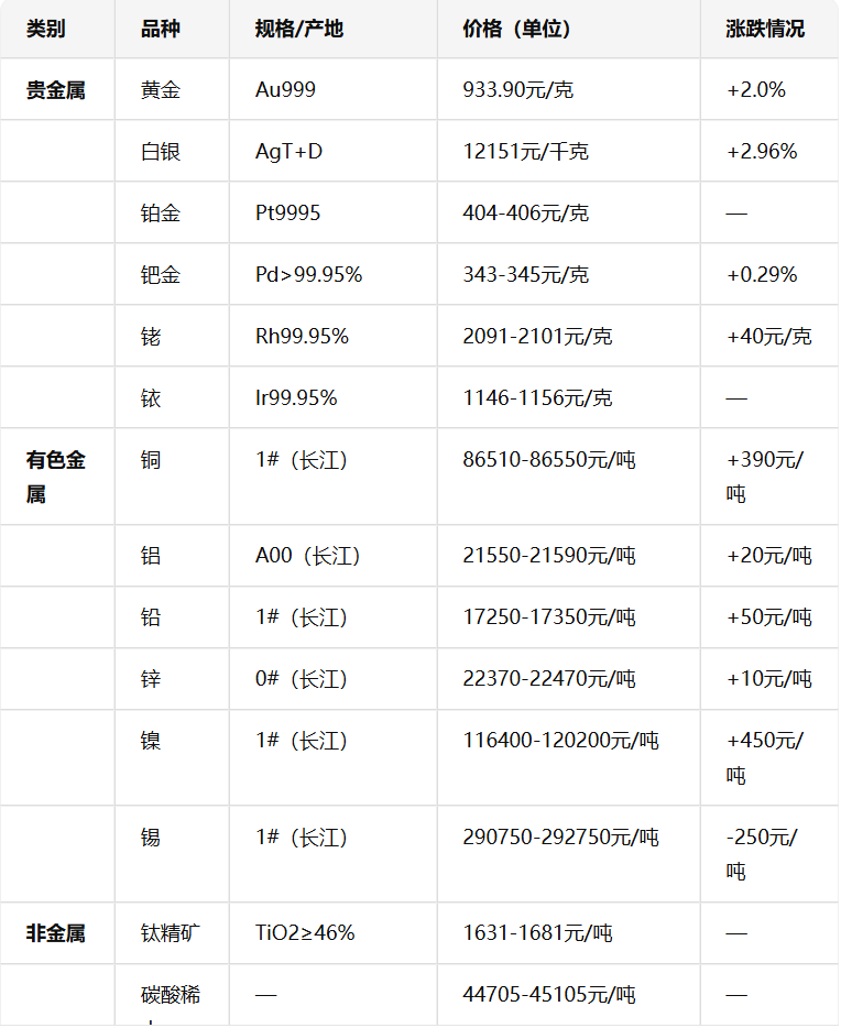 数据综合自上海黄金交易所、长江有色金属网、金投网等权威来源: