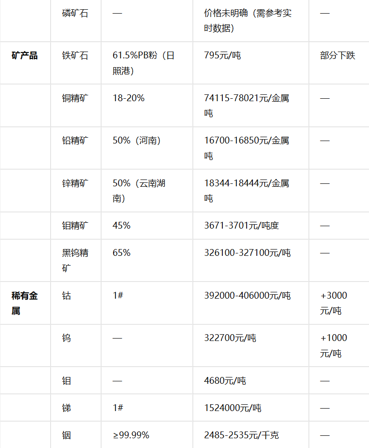 价格单位统一为元/克、元/千克、元/吨等,部分品种标注了涨跌幅度或价格区间。 铁矿石价格因港口和品质差异存在波动,需具体到港查询。 稀有金属如铑、铱等因市场稀缺性,价格波动较大,需关注实时行情。 数据综合自多个权威来源,但具体交易需以实际市场报价为准。